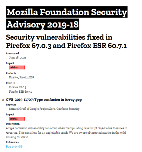 由于Array.pop中的问题,操作JavaScript对象时可能会出现类型混淆漏洞。而这种漏洞会给用户的Firefox使用带来灾难性后果(该漏洞能够让黑客操纵JavaScript代码诱骗用户访问,并将恶意代码部署到他们的PC上)。
